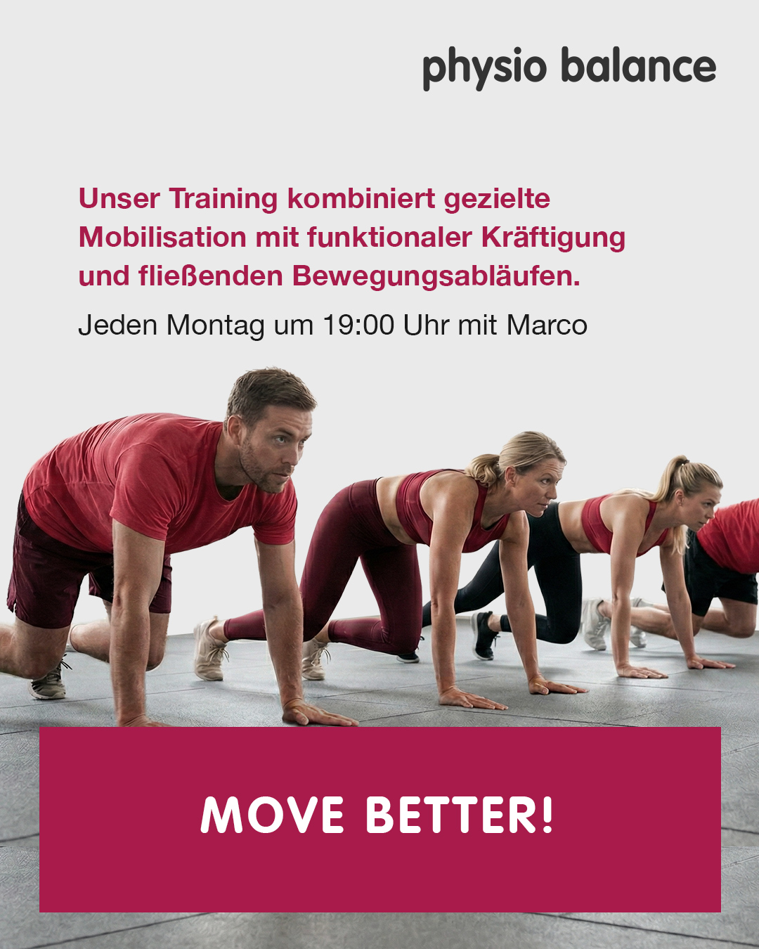 MOVE BETTER! kombiniert gezielte Mobilisation mit funktioneller Kräftigung und fließenden Bewegungsabläufen.