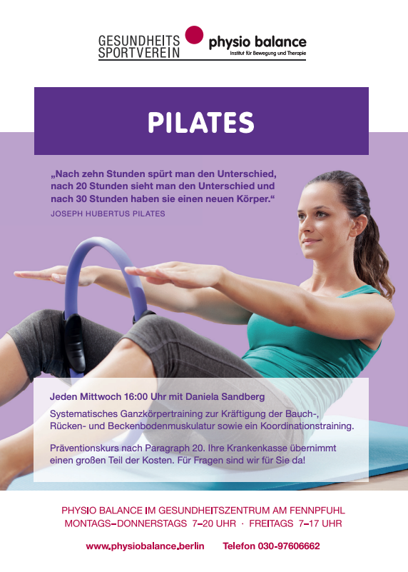 Systematisches Ganzkörpertraining zur Kräftigung der Bauch-, Rücken- und Beckenbodenmuskulatur sowie ein Koordinationstraining. Für Fragen sind wir für Sie da!